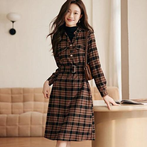 [스타일온미][루이스엔젤] 세리드 리본 벨티드 체크 플레어 카라 원피스