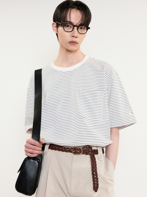 [티엔지티] 화이트 세미오버핏 스트라이프 크루넥 티셔츠
