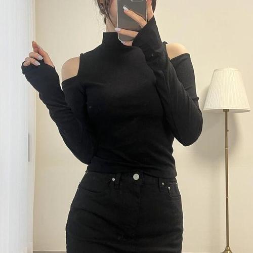 [다잇템_패션]여자 터틀넥 핸드워머 어깨트임 핏 티셔츠