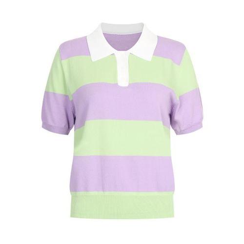 여성 카라넥 단가라 파스텔톤 반팔 니트 티셔츠 BOM-WKN-20676-연두