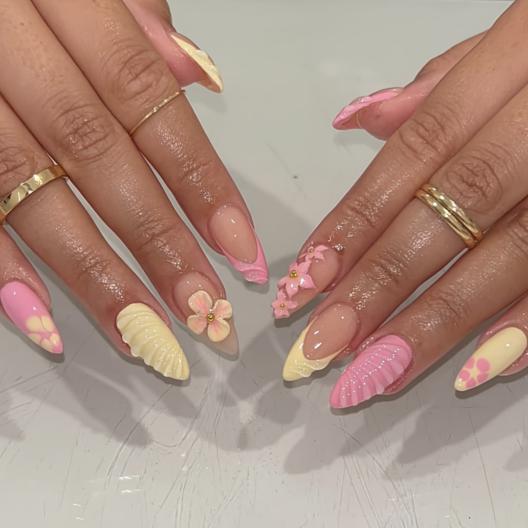 TEMU 분홍색 그라데이션 나비 리본 수공 진주 광택 사각형 네일 폼, 빨간색 라인 악센트 및 중간 길이 - 꽃 무늬 네일 아트 디자인|네일아트