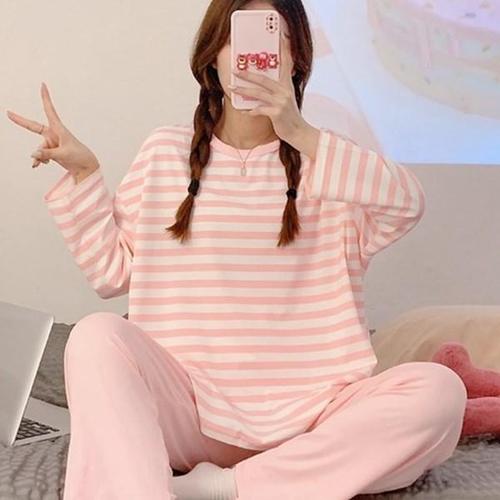 [옷자락] 여성 캐주얼 파자마 세트 반소매 스트라이프 오버사이즈 팬츠