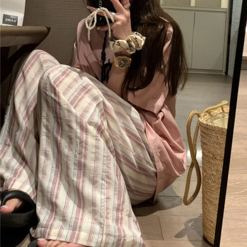 [옷자락]여자 파자마룩 배색 스트라이프 지지미 와이드 바지