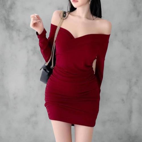 [옷자락]여성 파티 드레스 오프숄더 슬림핏 긴팔 셔링 미니 원피스