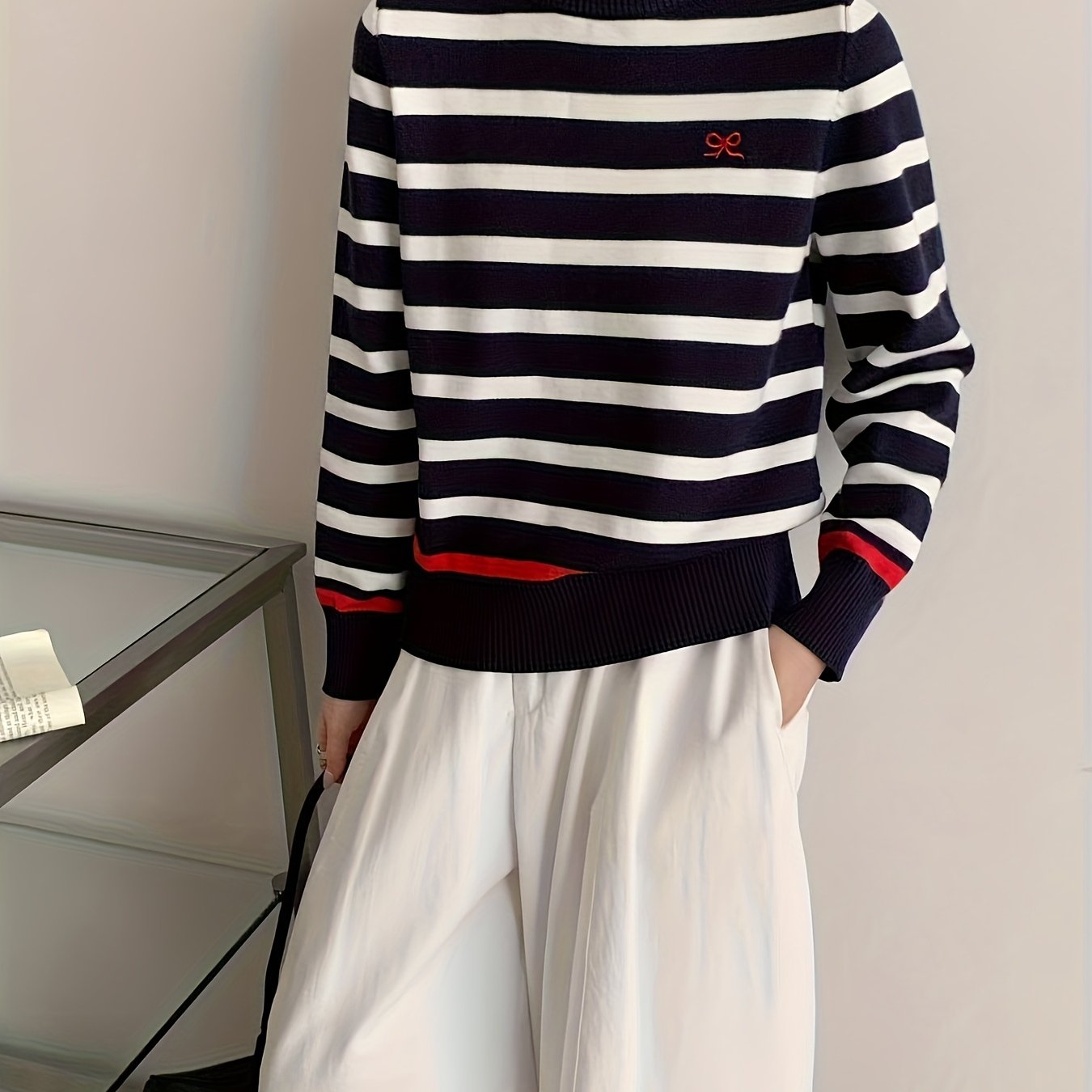 TEMU 여성용 우아한 컬러 블록 스웨터 - 루즈핏 라운드 넥 풀오버와 대비 트림, 사계절 내내 캐주얼 및 포멀웨어 탑, 캐주얼 웨어 탑 | 대조 트림 탑 | 건축, 여성 스웨터