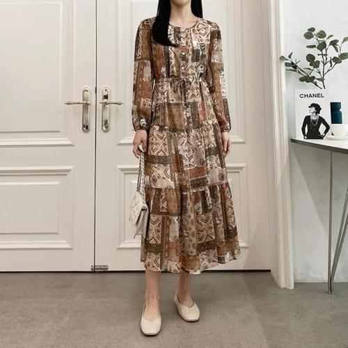 봄 가을 여성 긴팔 롱 원피스 캐주얼 패치워크 슬림핏 롱원피스 데일리 여자 하객룩 원피스 YJW