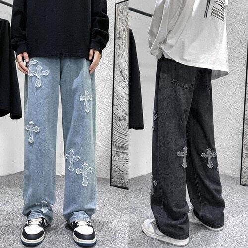 [아이에스이랩]남자 패치 포인트 와이드 청바지 데님팬츠 I5PC048