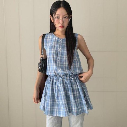 [신상오픈런]여성 체크 패턴 코튼 민소매 미니 드레스 배색 원피스