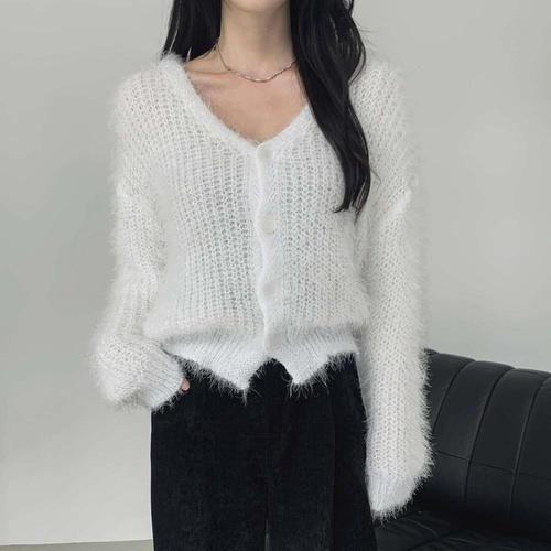 [신상오픈런]여성 울혼방 부클 퍼 브이넥 여유핏 니트 가디건