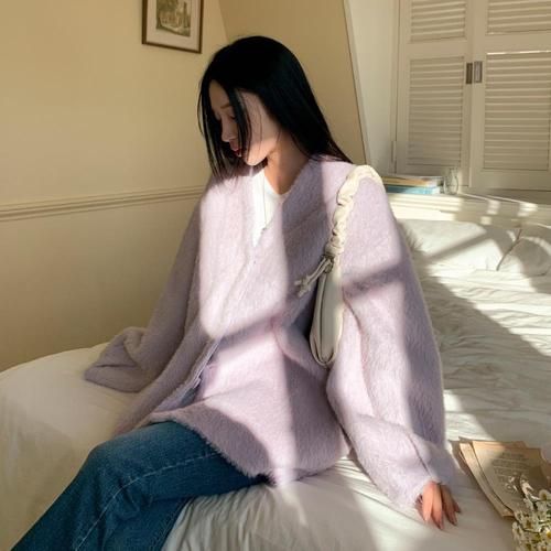 [여리핏_털빠짐X] 르위 여성 앙고라 세미 크롭 니트 가디건 루즈핏 여리여리 긴팔 티셔츠