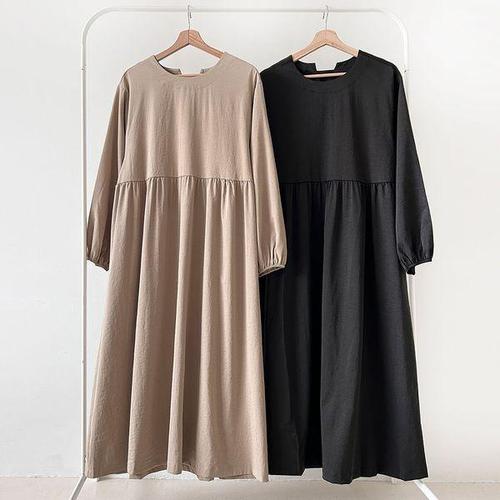 [신상오픈런]여성 코튼 핀턱 무지 원피스 플레어 퍼프 롱 드레스