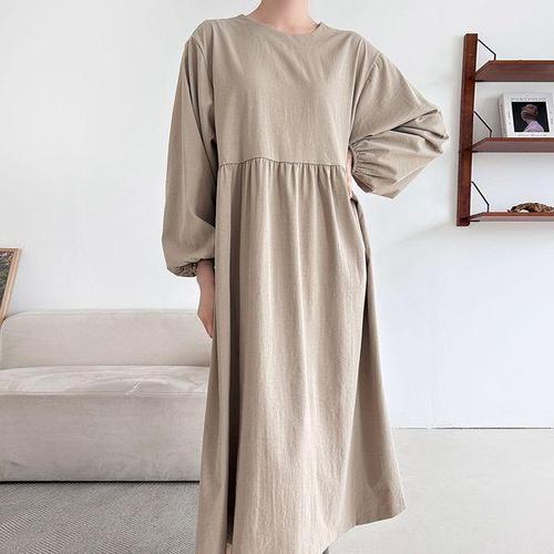 [미라클세븐]여성 코튼 핀턱 무지 원피스 플레어 퍼프 롱 드레스