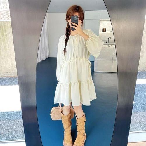 [신상오픈런]여성 가을 셔링 라운드넥 캉캉 스트링 퍼프 소매 미니 드레스