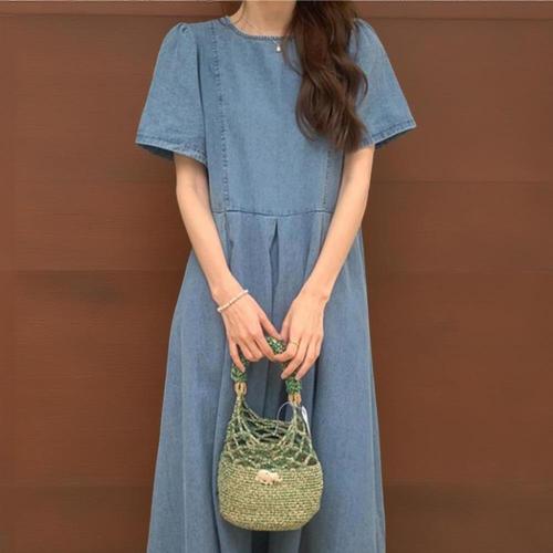 [신상오픈런]여성용 데일리 퍼프 소매 포켓 디자인 청 반팔 롱 드레스