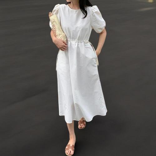 [미라클세븐]여성 사랑스러운 단색 면 퍼프 소매 반팔 플레어 롱 드레스