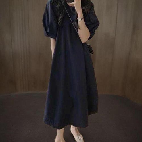 [신상오픈런]여성 사랑스러운 단색 면 퍼프 소매 반팔 플레어 롱 드레스