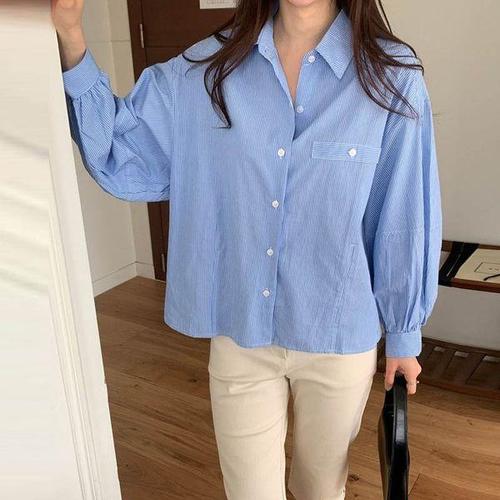 [보리맘]퍼프 벌룬 소매 셔츠 루즈핏 포켓 코튼 남방 블라우스