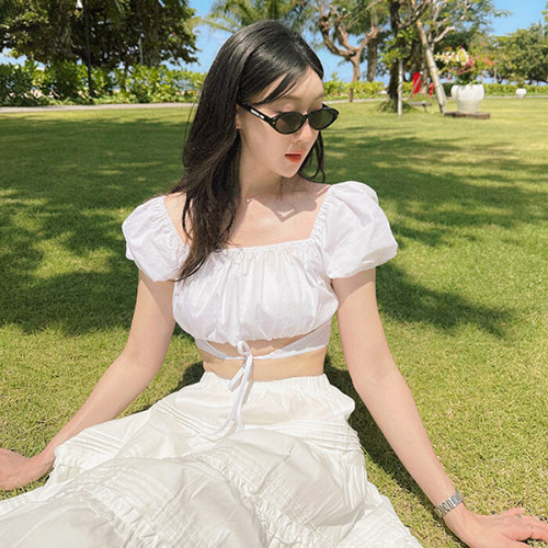 더클립 / 리보닝 스퀘어넥 퍼프소매 리본 크롭 블라우스