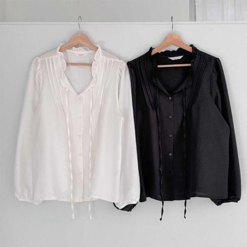 [옷자락]여성 봄 하객룩 프릴넥 스트랩 버튼 퍼프핏 박시 블라우스