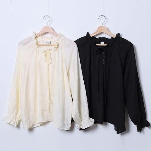 [옷자락]여성 프릴 리본 작은 단추 퍼프 시스루 빅 봄 블라우스