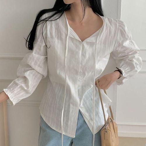 [보리맘]자가드 끈 블라우스 면 셔츠 퍼프 타이 루즈핏 허리끈