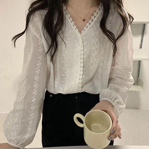 [오너클랜]인기상품 여성 브이넥 펀칭 레이스 긴팔 블라우스 데일리룩 [WFJOOWR_260323]