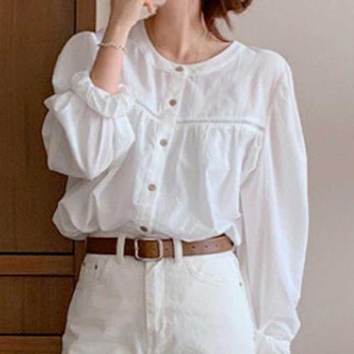 [에이치플러스몰]퓨어 라운드넥 셔링 블라우스 러블리 벌룬 소매 펀칭