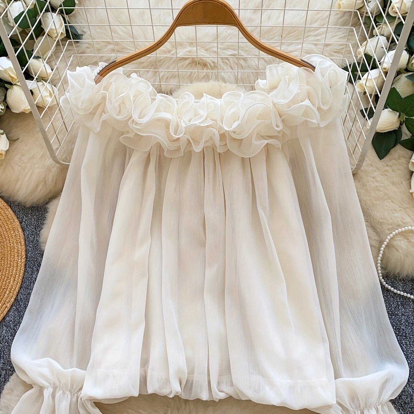 TEMU 여성용 우아한 오프숄더 시폰 블라우스 - 긴 소매 루즈핏 러플 트림, 오프숄더 넥 웨딩 게스트 웨딩 브라이덜 블라우스 (봄/가을용)