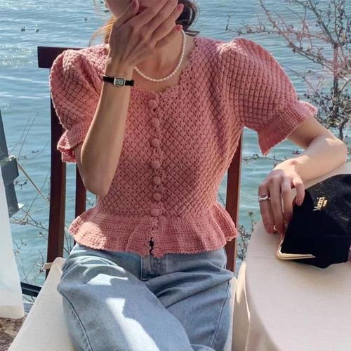 [다잇템_패션]여성 탱크 위빙 벌룬소매 펀칭 반소매 가디건