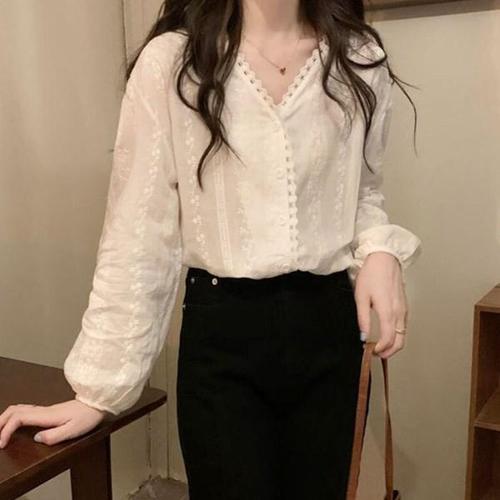 [다잇템]여자 흰색 펀칭 V넥 레이스 롱슬리브 블라우스