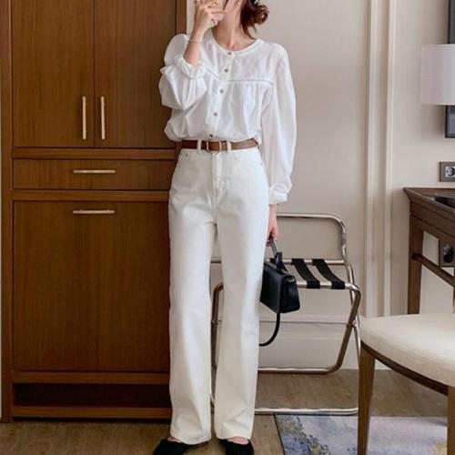 여성 로맨틱 레이스 블라우스 데일리아트 프렌치 빈티지 펀칭 셔링 라운드넥 셔츠 스포M1