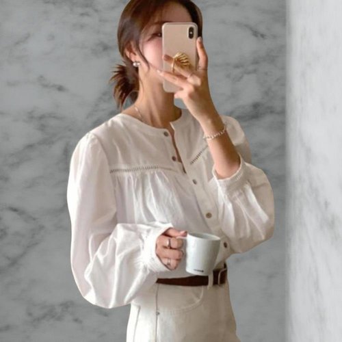 [옷자락] 여성 퍼프 소매 노카라 펀칭 디테일 긴팔 블라우스