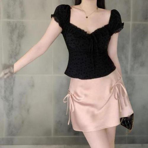 [옷자락]여성 하트넥 펀칭 퍼프 슬림핏 폴리 셔츠