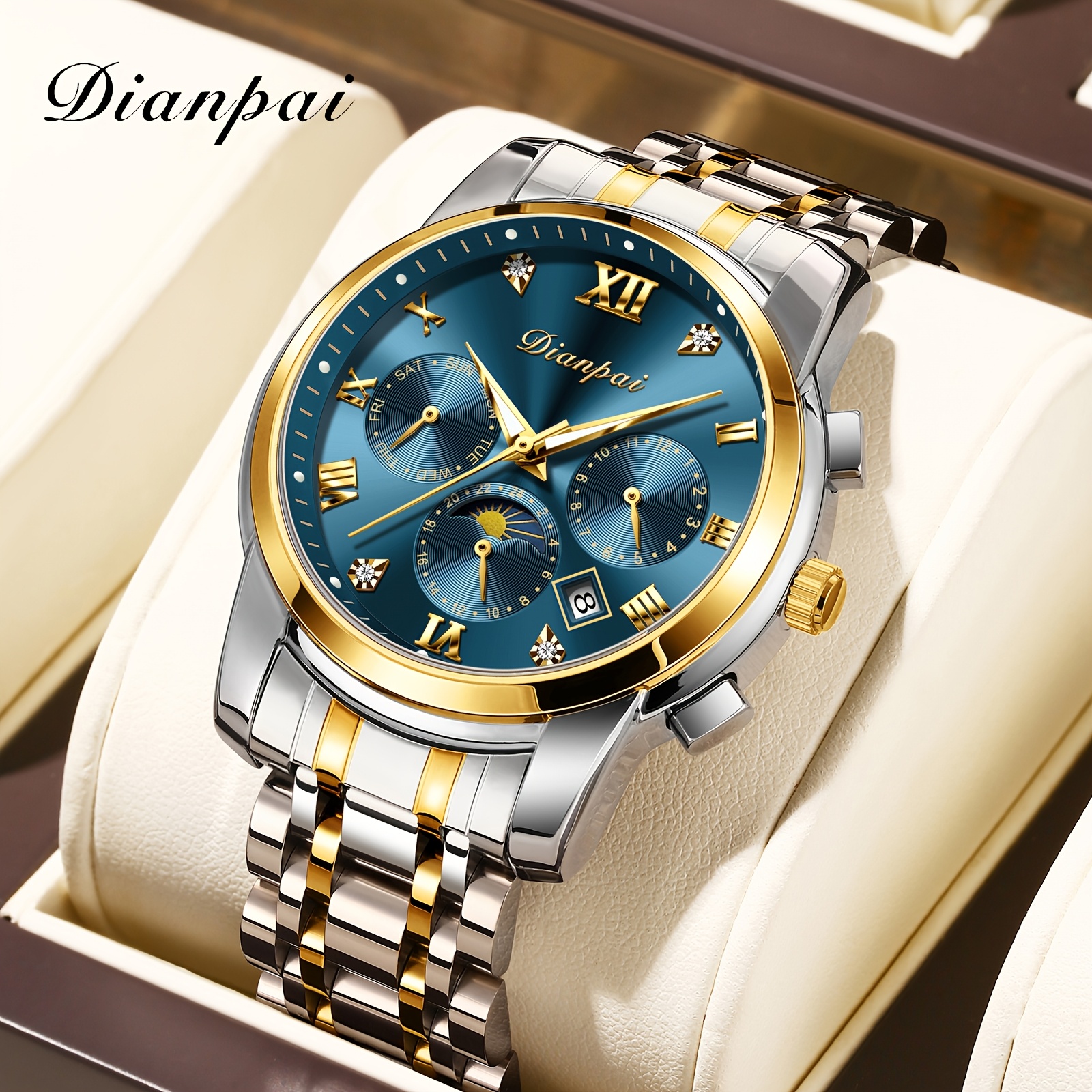 TEMU 디안파이 남성용 비즈니스 자동 와인딩 시계, 스테인리스 스틸 패션 문페이즈 디스플레이 및 루미너스 캘린더, 남성 선물용 손목시계