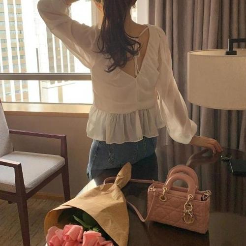 [신상오픈런]여성 시스루 벌룬 리본 장식 페플럼 블라우스
