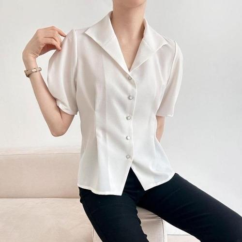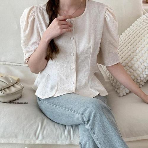 PETITBATH 여성의류 오피스룩 페플럼 버튼 카라 블라우스 슬림핏 페미닌 정장룩 퍼프소매 셔츠