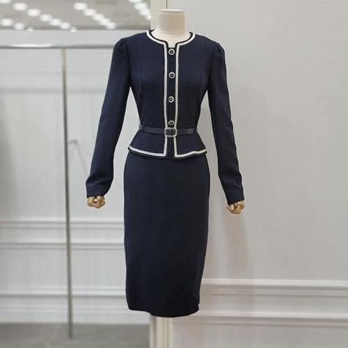 AURALA 여성 정장 원피스 가을 빅사이즈 브이넥 조임 더블 오피스 미디스커트 L0923-05