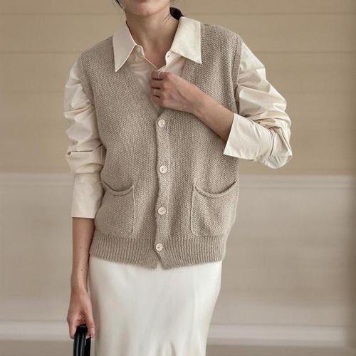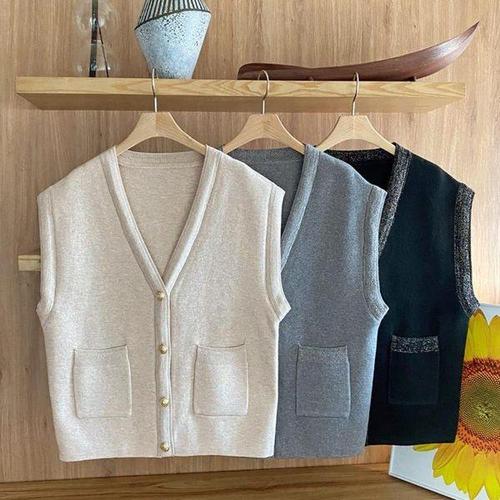 [신상오픈런]여성용 루즈핏 비스코스 니트 베스트 금장 포켓 디자인