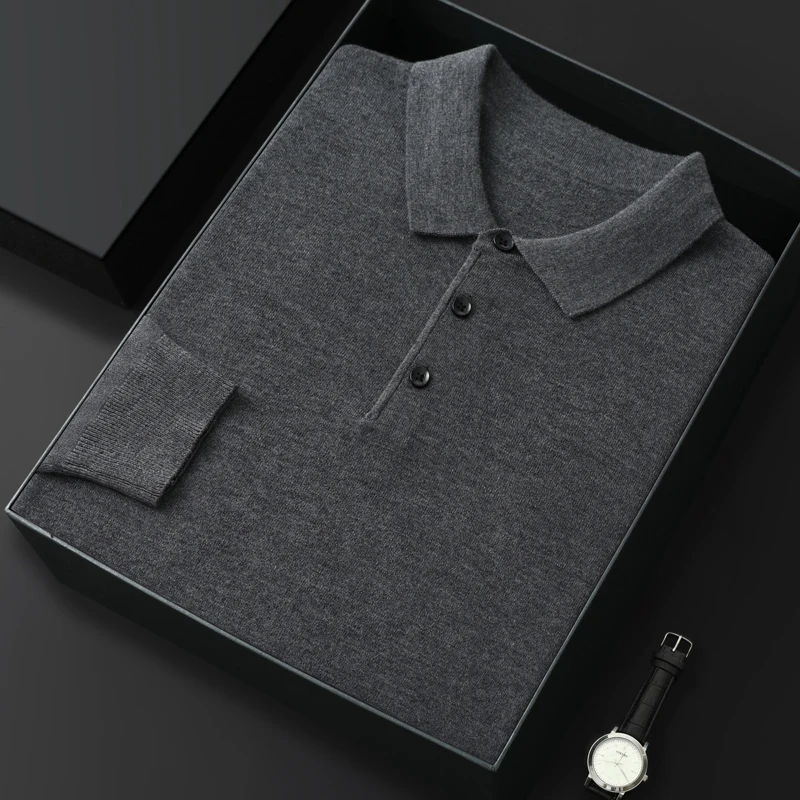 메리노 울 남성용 라펠 풀오버 긴 소매 폴로 넥 스웨터 루즈 탑 비즈니스 캐주얼 니트 바닥 셔츠