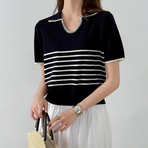 [핑크엘리제]폴로 카라넥 스트라이프 반팔 니트티 웰터니트티