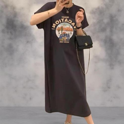 [신상오픈런]여성 캐주얼 폴리에스터 스판 나염 프린트 반팔 롱 드레스