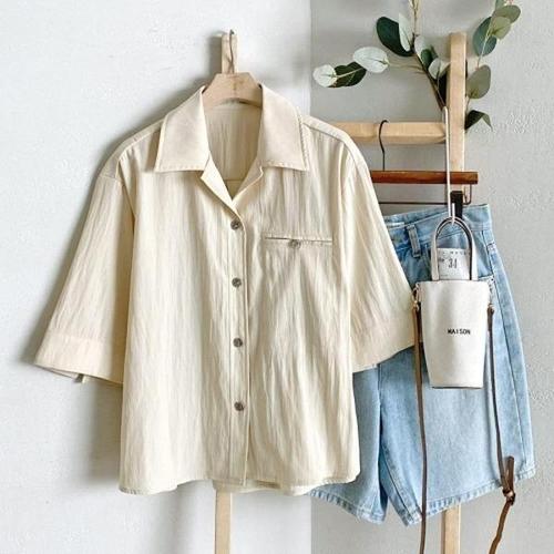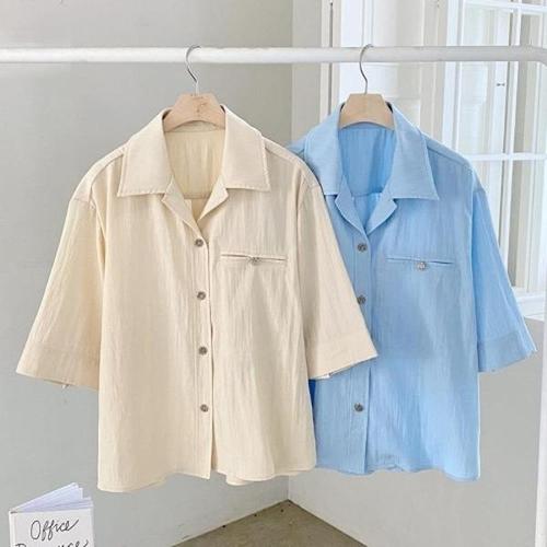 [옷자락] 여자 오버핏 문양단추 폴리 카라넥 반팔 셔츠 남방