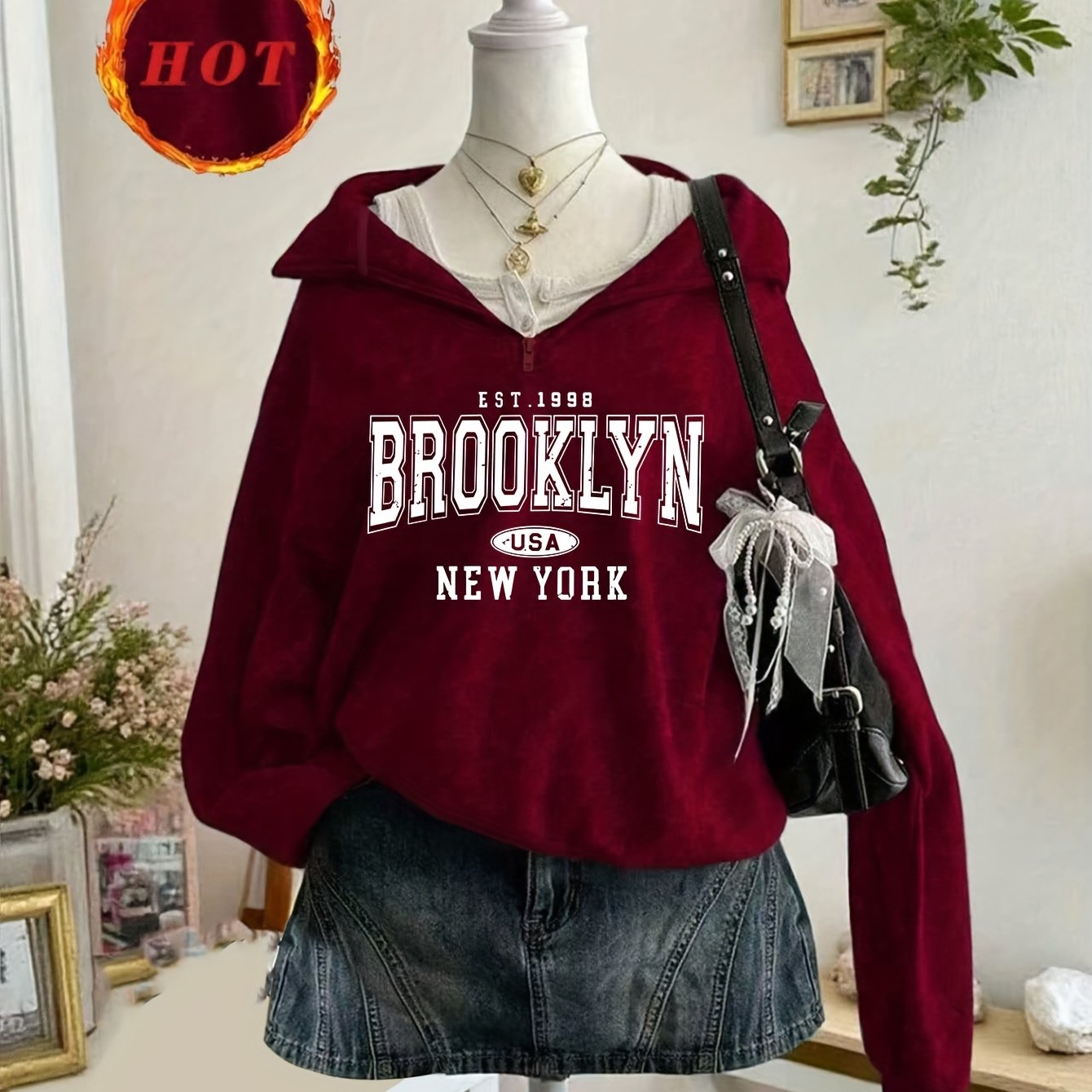 TEMU 시티 레터 프린트 지퍼업 터틀넥 스웨트셔츠, 캐주얼 긴소매, 여성 의류