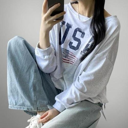 [신상오픈런]|KST99A3|여자 원숄더맨투맨 프린팅 루즈 오버핏 가을 티셔츠_23110594_597559