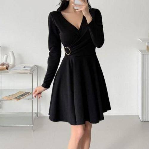 [옷자락]여성 러블리 브이넥 플레어 미니 원피스 골드링 랩