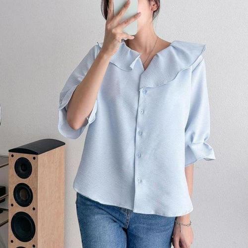 [다잇템][다잇템] 여성 엉덩이커버 네이비 부드러운 프릴 카라 언발 블라우스_17190619_588872