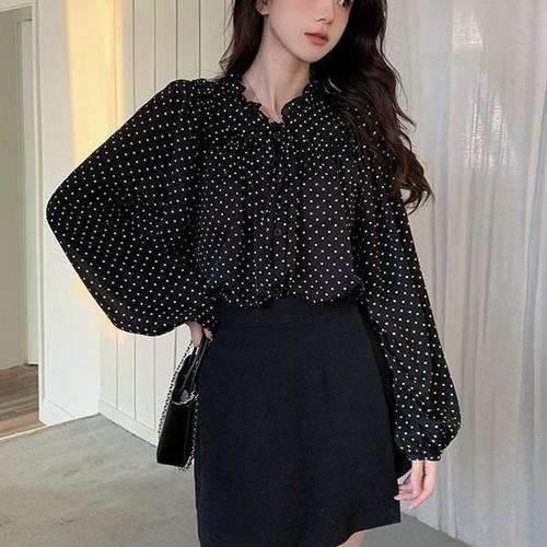 [셀러허브_여성트랜드패션]ONM 벌룬소매 프릴 도트 체형커버 긴팔 블라우스