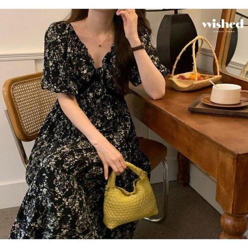 [위시드]셔링 브이넥 레이스 포인트 플라워 반팔 원피스 (WIAAOP185)
