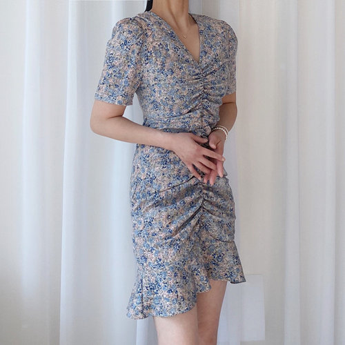 미즈큐즈 / 핏 대박 셔링 플라워 프릴 원피스