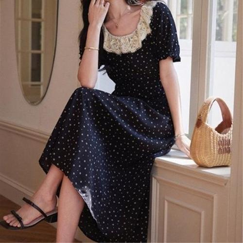 [다잇템]여성 플라워패턴 반소매 레이스 롱 원피스
